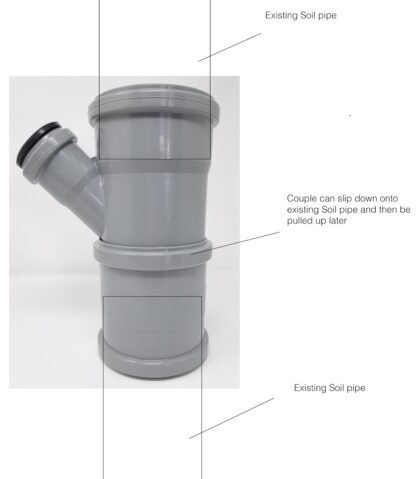 Instructions for retrofit installation into soli stack: Using the Branch as a guide cut approximately 14.5 cm out of the soil pipe. After adding lubricant such as washing up liquid to the couplers rubber seals and pipe insert the coupler and push it down out of the way. Then again after lubricating the Branch push it up onto the soil pipe. Then push the coupler back up and into the Branch to complete the Installation.